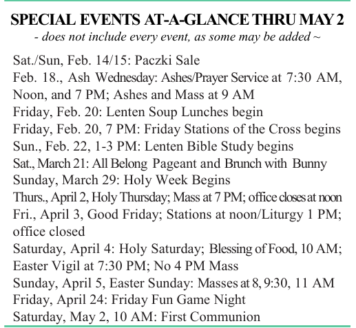 NOTE: The High School Youth Group Valentine Party (Feb. 8) has been cancelled.